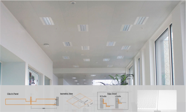 Clip-In concealed panels provide durable and monolithic ceilings for interior and can be used in external conditions where the False Ceiling is not directly exposed to rainfall. Clip-In panels are available in a variety of rectangular and square sizes like 600*600mm, 1200*600mm, 1200*300mm, 300*300mm & custom sizes. Modular and circular light fitting and grilles can be integrated within the Clip-In system.