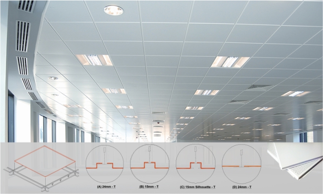 Lay-In tile is most popular bearing system to realize false ceilings with visible 24 mm, 15 mm & Silhouette T grid. Panels are durable and versatile metal panel ceilings available in a wide variety of sizes like 600*600mm, 1200*300mm, 1200*600mm etc. Lay-In tile is simple to install and give easy access to equipment installed above them, allowing rapid intervention & maintenance. Lay-In tegular system provides an economic solution to many ceiling requirement. Various acoustical criteria can be met with the inclusion of acoustical inlays in the back of a perforated tile.